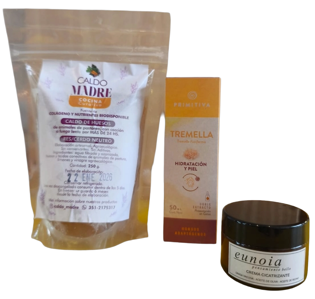 Un combo pensado para nutrir el cuerpo desde adentro y acompañar el cuidado de la piel desde afuera, combinando nutrición ancestral, adaptógenos y cosmética natural.